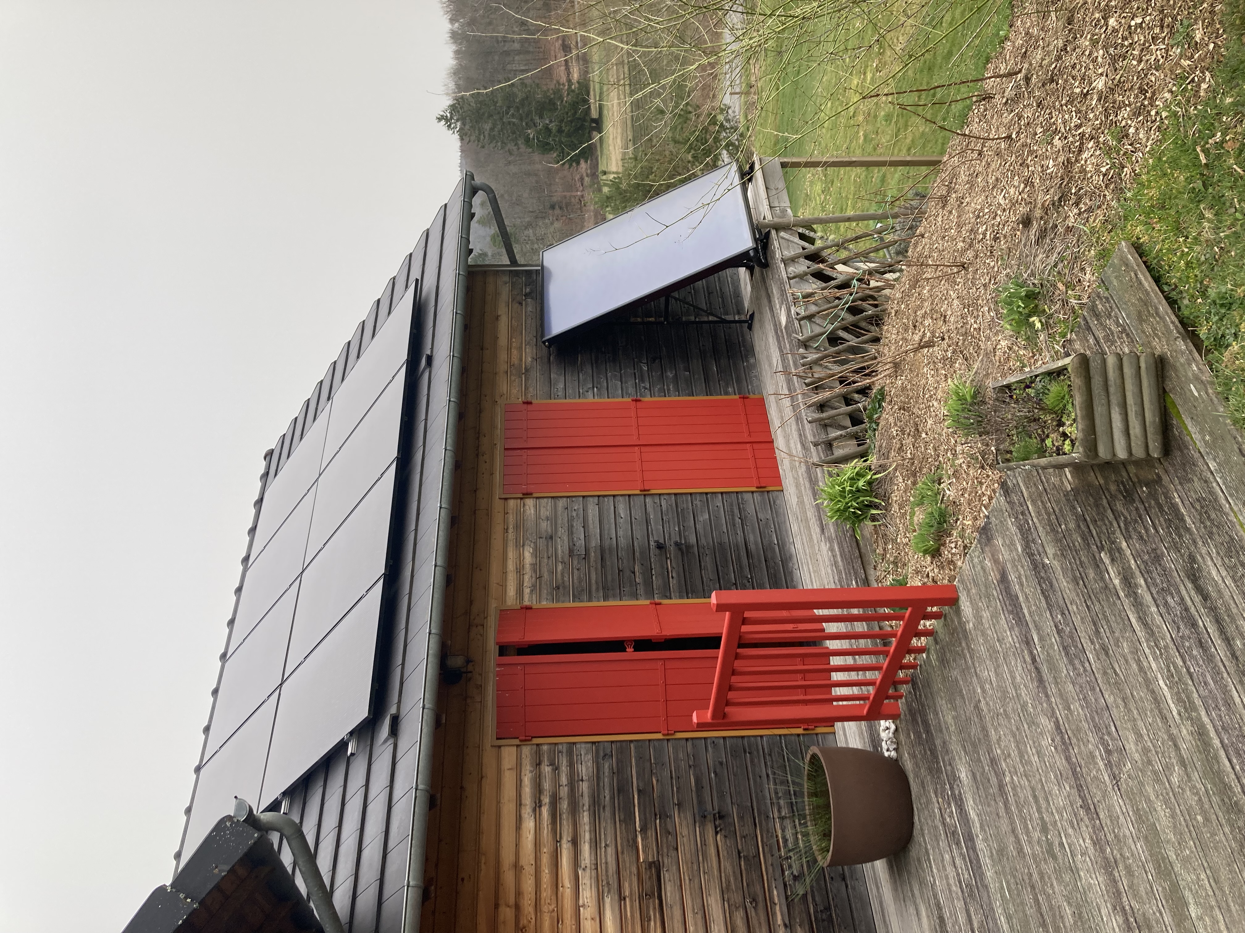 Système combinant les énergies du bois et du soleil pour chauffer la maison et l'eau chaude sanitaire.